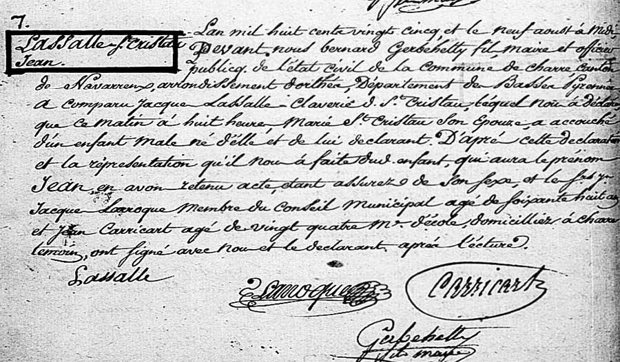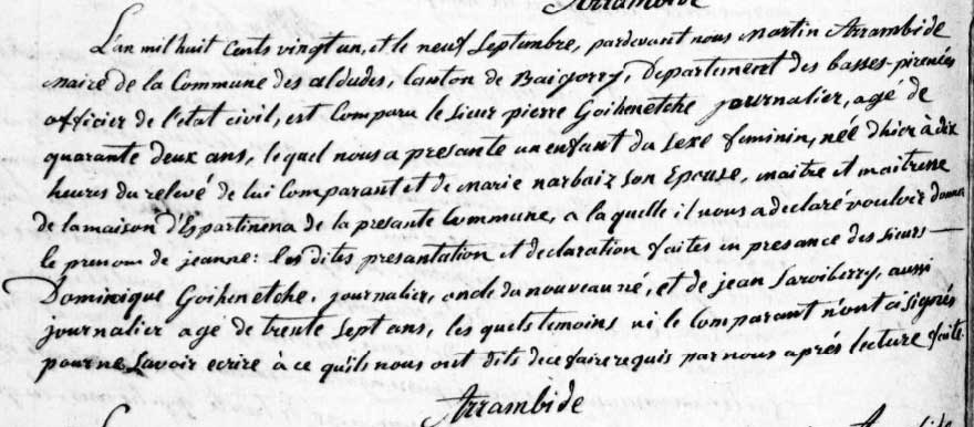 Jeanne Goyenetche épouse de Jean Lassalle est née le 9 septembre 1821 aux Aldudes, canton de Baïgorry, fille de Pierre Goihenetche, journalier, et de Marie Narbaitz son épouse, maître et maîtresse de la maison d’ Espartinena des Aldudes.