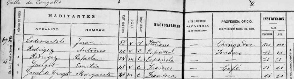 Raymond Berjolis apparaît aussi dans le recensement de Buenos Aires de 1869, il est encore célibataire et exerce la profession de « mercero » qui signifie vendeur d’articles de mercerie en relation avec son premier métier de tailleur d’habits.