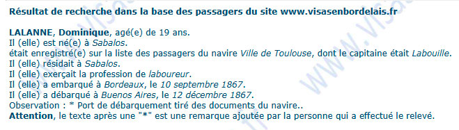 Dominique Lalanne, 19 ans,est parti de Bordeaux le 10.9.1867 sur le bateau « Ville de Toulouse ». Le bateau a débarqué à Buenos Aires le 12.12.1867.