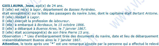 Le 15 octobre 1866, Jean Guillauma, 24 ans, accompagné de Pierre, son jeune frère de 15 ans, embarquent du port de Bordeaux sur le navire « Jules » ; le bateau n’atteindra Buenos Aires que le 7 janvier 1867. Deux mois et trois semaines, voyage anormalement long, certainement des problèmes à Montevideo où les navires faisaient escale à cette époque. Les deux frères Guillauma ont dû débarquer à Montevideo et s’installer en Uruguay.